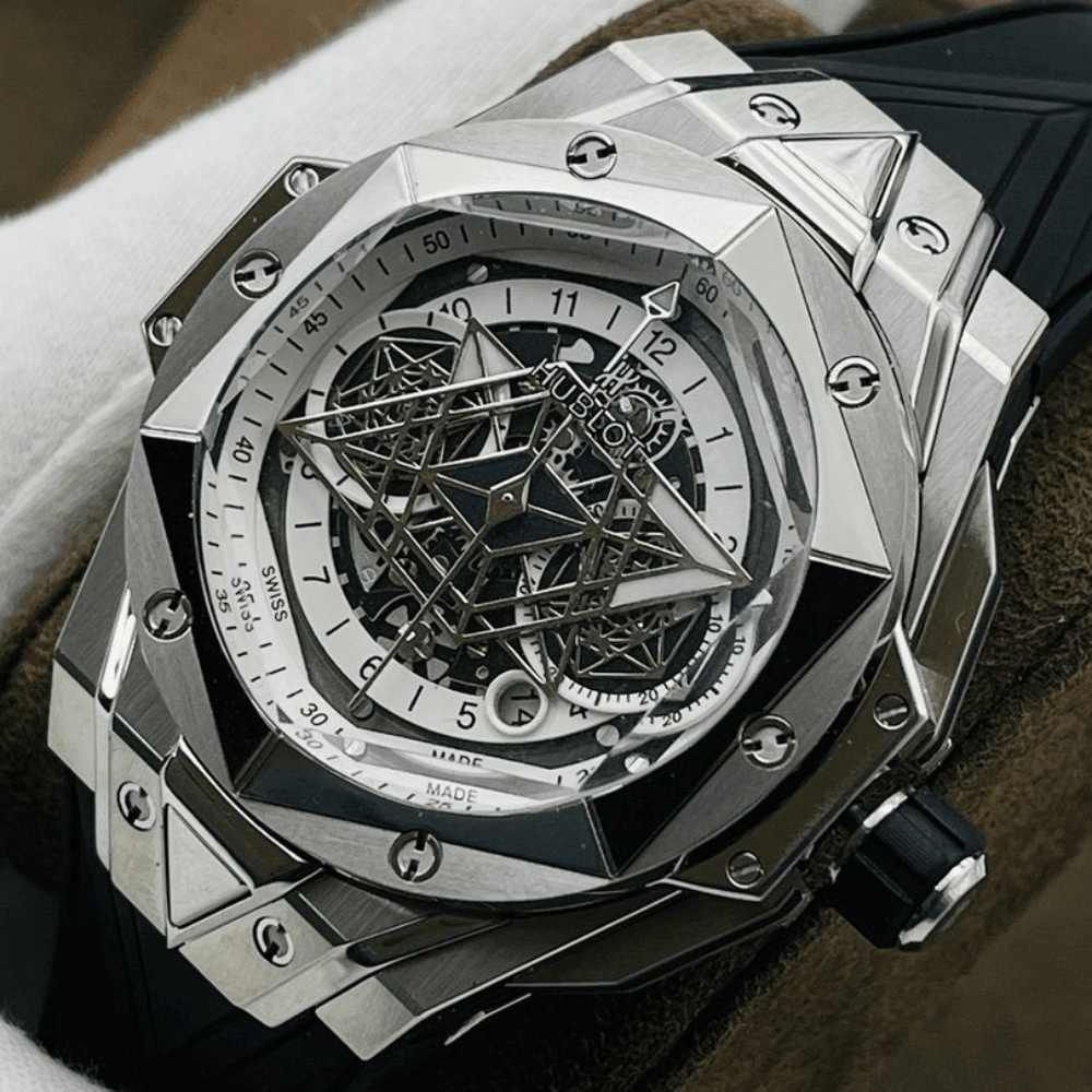 1. 직경 45mm! 그래픽 요소가 케이스를 관통하며, 커팅과 인그레이빙을 통해 육각형 베젤에 통합되었습니다. 6개의 H형 티타늄 나사가 베젤을 단단히 고정합니다. 러그는 가파른 각도와 강인한 라인으로 강렬한 디자인 감각을 선사합니다! 2.